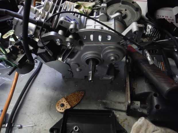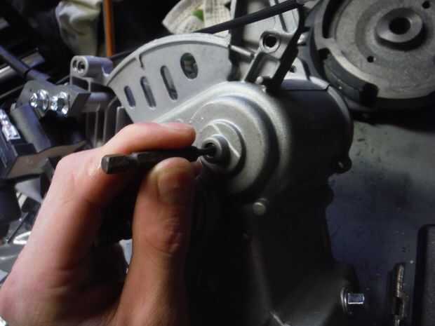 Utilizando el mismo método que usamos para quitar el brazo del gobernador, ahora vamos a eliminar el engranaje. Asegúrese de obtener la lavadora detrás el engranaje así. Esto permitirá que el motor gire a casi dos veces la RPM que con el gobernador en su lugar. Una vez más, necesita tapar el agujero con un tornillo.