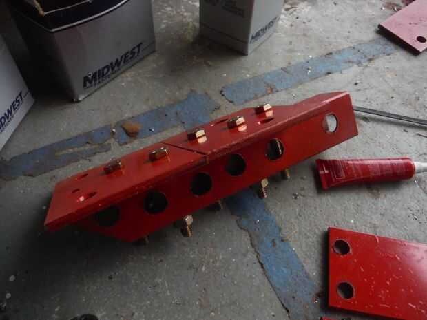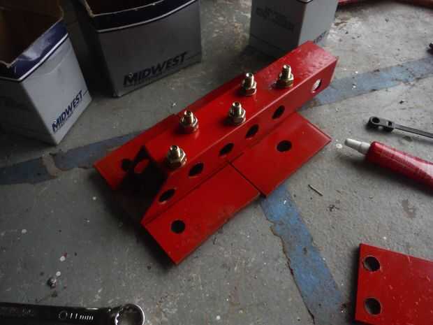 Después de haber perforado los agujeros, usa 6 1/4" tornillos, tuercas y arandelas para sujetar la placa de montaje a la pieza base. Recuerde utilizar threadlocker! Si usted quiere pintar sus piezas de metal (muy recomendadas para evitar que se oxiden) necesita pintarlos antes de que los pernos juntos.