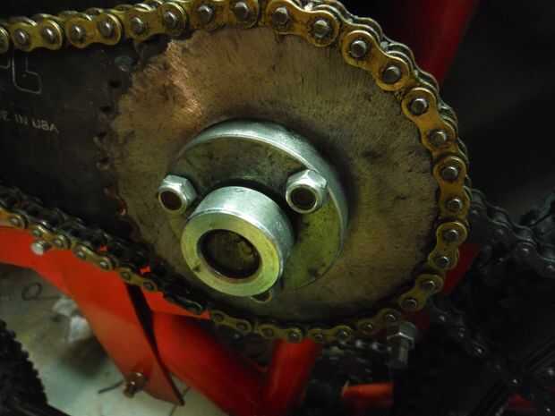 Ahora bolt su piñón 36t a 5/8" diámetro mini hub. Uso de enganchador de roscas y tuercas o arandelas de presión. Luego deslice el ensamblado mini hub y piñón en el eje. Ahora tomar un 5/8" diámetro a espaciador y corta con una amoladora o sierra de cinta para que sea aproximadamente 1/2" de largo y deslícelo en el eje entre el mini y la placa del eje de unión (se necesita sacar el mini hub para ello). Deslice el cubo mini, otro 3/16" llave de parte movible y deslice un collarín de bloqueo de 5/8" en el extremo del eje. Apriete todos los tornillos de fijación del cubo de mini y cerradura de cuello (y uso threadlocker).