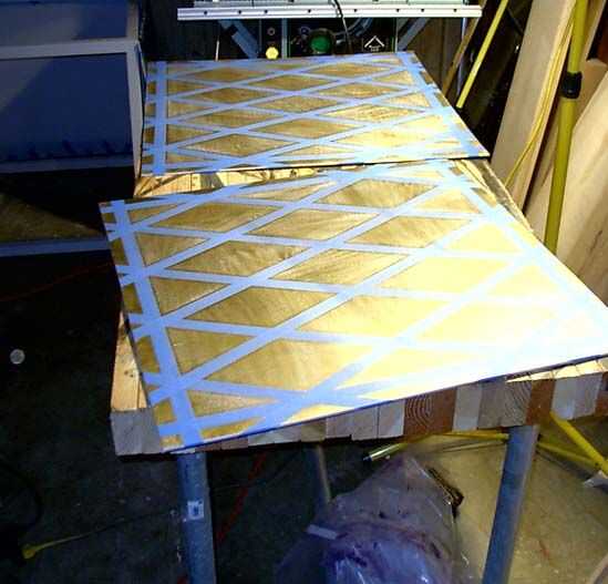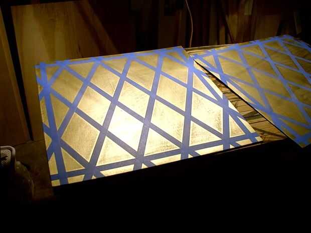 Con el diseño de pintura diseñado, me fui a trabajar. No es necesario pintar el panel inferior, dejé minas, gris de la imprimación. El primer paso fue pintar la capa base, que es el oro. Pinté el oro de todo el panel para asegurar un buen acabado liso. Me puse 2 capas de pintura en aerosol oro. Después de que el oro de la pintura había secado un par de días que empecé a grabar los diamantes. Grabó primero el borde exterior, que es de 2 pulgadas desde el borde del panel, esta área será cubierto por el adorno que se añadirán más tarde. Luego divide el grupo en cuatro filas y ocho columnas, luego con cinta hacia fuera de los diamantes.