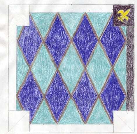 Como la cartilla en los paneles secos, hice algunas investigaciones para determinar cómo el cuadro debe ser pintado. Para obtener algunas ideas utilicé Image search de Google "Jack in a Box" y "gato en la caja". Encontré un par que eran francés inspirado, con un patrón del diamante que me ha gustado. Siempre he disfrutado de los morados, dorados y turquesas utilizadas en carnaval, así que decidí ir con ese esquema de color. Para ver cómo se veía antes de pintar el cuadro entero, me lo sacó y había coloreado en el uso de lápices de colores. En el momento que me iba a poner una flor de lis en cada esquina, así que dibujé uno. No he podido encontrar un alivio de la flor de lis que era del tamaño correcto, así que en vez utilizar los cráneos, que al final probablemente mejor.