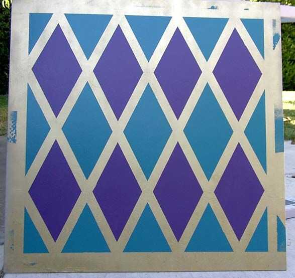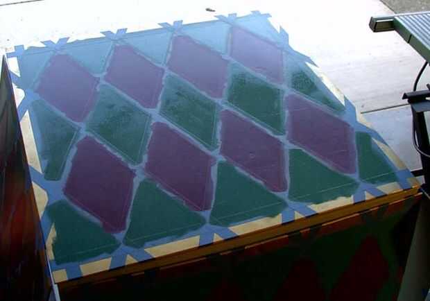 Una vez que los diamantes fueron grabados hacia fuera, usando lija 220 iluminado lija la pintura oro expuesta. Se va pintando esta zona púrpura o turquesa, tan a la ligera desbastar la pintura oro con papel de lija ayudará a las capas superiores se adhiere un poco mejor. Mi dibujo como una guía, la parte superior, media e inferior diamantes fueron pintados turquesa y las dos hileras de diamante completo fueron pintadas de púrpura. Dependiendo de la pintura que tiene puede tomar múltiples capas para cubrir totalmente el oro. La pintura turquesa había sólo requerí dos capas, mientras que el púrpura necesita cuatro. Después de la última capa púrpura se había secado lo suficiente que ya no era pegajoso, la cinta de pintores fue quitada, y la frontera de oro entre los diamantes fue expuesta.