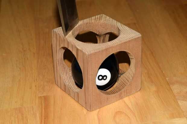 Que no sean potencialmente hervir otra vez el cubo y 8-ball y repitiendo el proceso antes, la única manera de conseguir la bola hacia fuera es romper el cubo alrededor de él. Utilizando un cincel, este cubo de prueba no fue rival y la bola 8 se quita fácilmente.
