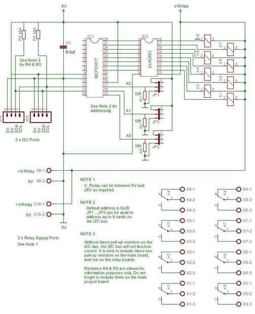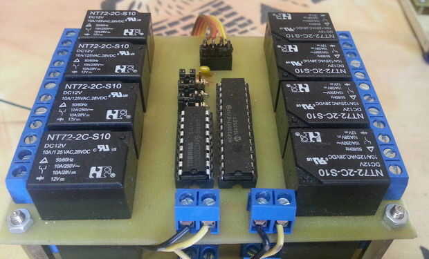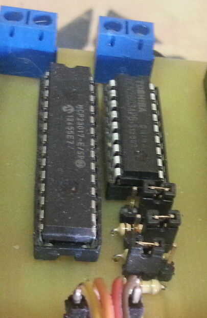 Después de las primeras pruebas del sistema, no quiero todos los cables entre la CPU y relés. Como he incluido un puerto I2C en el tablero de CPU, decidí diseñar la placa de relé para conectar al puerto I2C. Usando un chip de MCP23017 expansor de puertos de entrada-salida de 16 canales y una matriz de transistores ULN2803, disminución de las conexiones entre la CPU y relés a 4 hilos.