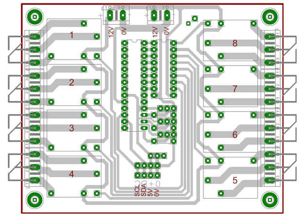 Como no pude ajuste 16 relés en un 80 x 100mm PCB, decidí hacer dos tableros. Cada MCP23017 usa sólo 8 de sus 16 puertos. Tablero 1 maneja la Junta 2 y 8 salidas las dos salidas auxiliares. La única diferencia de las tarjetas es las direcciones de cada tablero. Esto se establece fácilmente con un mini puente. Cada placa tiene conectores para fuente de alimentación y datos I2C a la otra tabla.