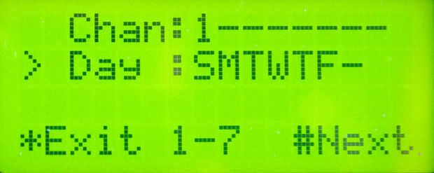 1-7 establecer días de semana. 1 = el domingo, 2 = el lunes, 3 = el martes, 4 = el miércoles, 5 = el jueves, 6 = el viernes, 7 = el sábado