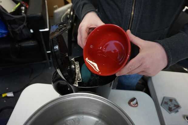 Si llena una tetera de agua caliente como esta, calentará agua asombrosamente rápidamente y luego se apagará cuando llega a ebullición. Usted puede tener tazones individuales para todos los participantes y vierta el agua caliente en cada plato. Cuando hace frío, simplemente verter en la tetera y vierta algunos más (el agua me alojé bastante caliente en la caldera por un tiempo, así que mezcla agua tibia nuevamente en no hace mucha diferencia a la temperatura global). Este es probablemente el método más fácil cuando se trabaja con un número mayor de personas, como puede fácilmente mantener la caldera y su derecho base donde estás.