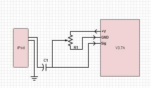 En el diagrama, estamos utilizando básicamente un canal de un iPod o un dispositivo amplificado similar (un mezclador salida de línea tal vez), el escudo o negativo o común de conexión a la tierra misma que está utilizando el controlador, con la línea de señal en el condensador. Te recomiendo un 1 casquillo bipolar electrolítico de 10uF. Si usted sólo ha polarizado tapas, poner la señal en la + lado del mismo.
