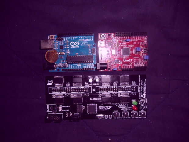 La nueva edición de negro SMT 1.X AMS consejos están en las obras. Estos tienen conector de módulo de entrada, Mic Audio disparador y son todos los chips SMT (así la AMS) - Un SNEAK PEEK en el prototipo es por encima con mi Arduino y PIC UNO32 cerca de él para la comparación de tamaño. Básicamente se trata del tamaño de 2 placas Arduino Uno al lado del otro.