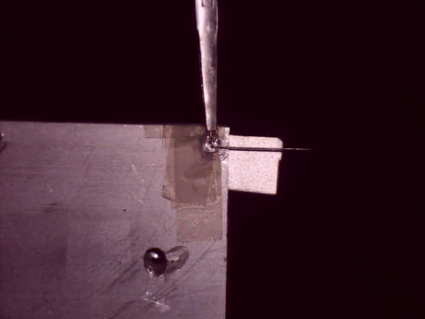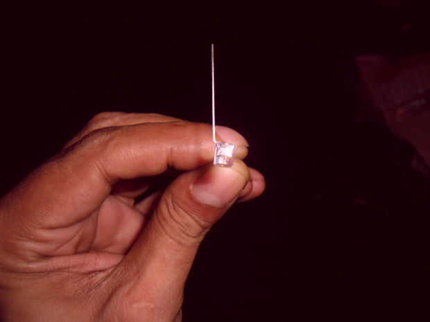 Alicate de nariz chata y deslícelos hacia abajo el ánodo hasta apenas golpean el borde externo del LED (borde de LED debe ser pegado sobre el bloque de aluminio si el agujero está correctamente instalado, y quieres las pinzas hasta la parada en el borde del LED).