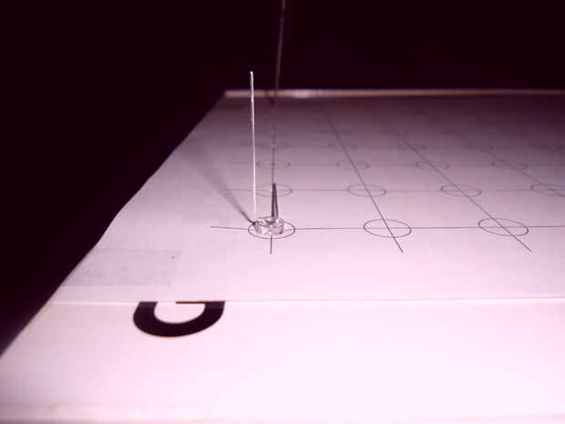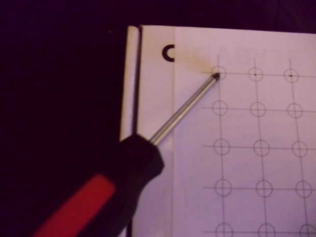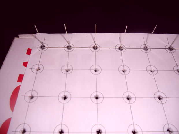 Meter un alfiler en cada intersección. Esto es como taladrar un agujero piloto. Usé una aguja de coser grande.
