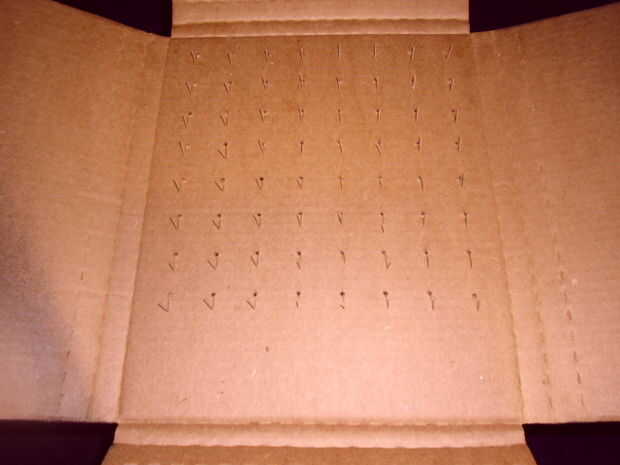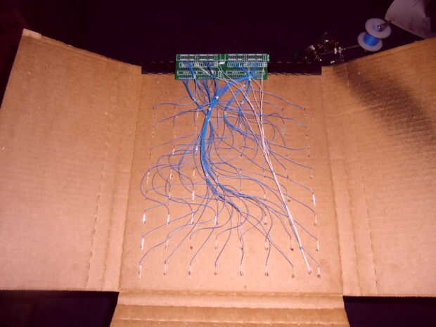 Una vez que todo era soldado, un poco de pegamento caliente llevó a cabo la junta con los conectores de 40 pines hacia el exterior de la cartulina después de fue doblado cerrado.