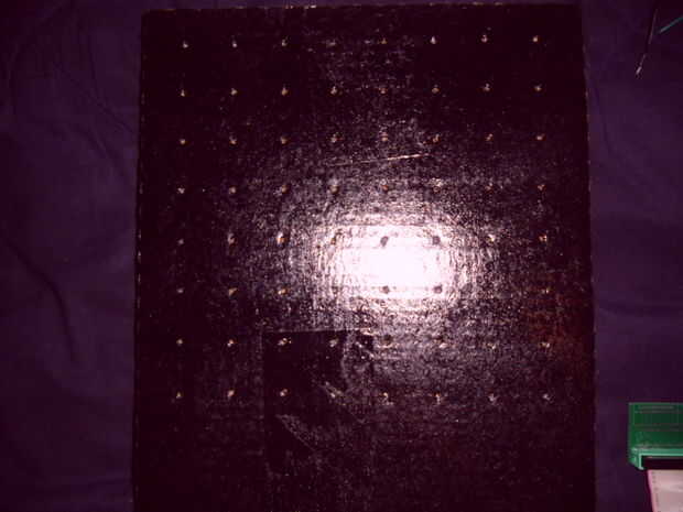 Penetra los agujeros al igual que para los "agujeros" en la base con un perno grande. Yo les ensanchó un poco con un destornillador mucho menor que antes (no casi igual de grande como el que utilicé para el LED plantilla de soldadura, pero lo suficientemente grande como para que no debe de ser una máquina para los conductores en ellos). Asomó entonces un agujero más para los cables de cátodo recorrer, que simplemente corrí hasta una esquina del cubo.