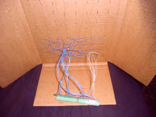 Una vez en cada plomo, he hojeado hasta el cubo por lo que fue boca abajo. Luego se coge cada cable desde abajo a medio camino el plomo con los alicates y mantener las pinzas verticales, tire el cable hacia mí hasta la parte inferior la mitad del plomo era plana contra el cartón. Fue ahora firmemente en su lugar y cuando me enganchado es alambre de columna a la cabeza, se doblaría la mitad superior del cable contra la parte inferior medio, sujeta el cable firmemente hasta que fue soldado.