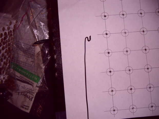 Que 64 lleva a alinear en los agujeros fue el siguiente reto - hice un "garfio" de alambre de mecánica, pero percha o algo parecido hubiese funcionado tan bien. Doblado una "S" en el extremo del alambre para que podía enganchar un cable y tire de él, o encadenar un plomo y empuje a donde necesita ir. Tuvo paciencia, pero finalmente cada plomo encontró su hogar.