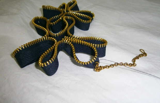 Coser cada una de las cadenas (o cinta de raso) a los extremos de la flor.