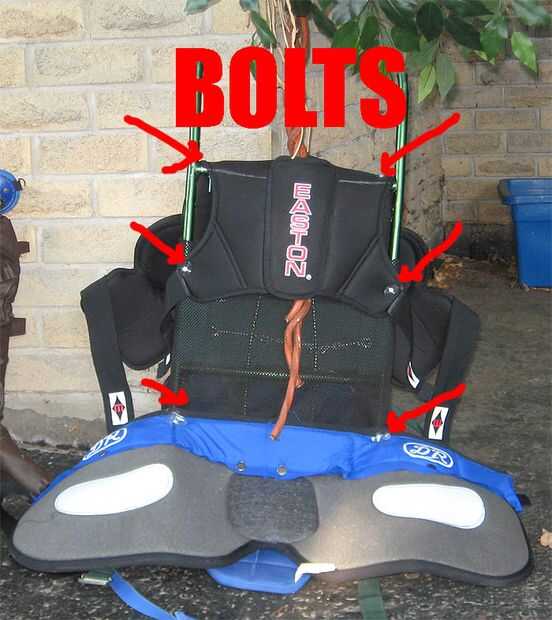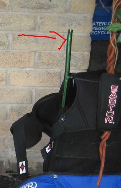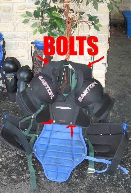 La armadura comencé atando el protector de pecho de béisbol a la parte de abajo de la porción del pecho de las hombreras con el alambre. Me continuedby las hombreras de cableado a la parte posterior del marco (meter alambre atravez de ellos después de la perforación o scissoring mejor para perforar un agujero para el cable, a través de una pieza de contrachapado en otro pedazo de madera o la tela puede pegar y enrollándose en la broca y desgarro). La parte delantera de las hombreras luego levantar sobre su cabeza las correas salen debajo de las axilas para fijar en el pecho y las correas de protector de pecho de béisbol ir alrededor de su cintura. Asegúrese de que no están en su rollo de grasa para la respiración. Pruebe el ajuste antes de cablearlos.