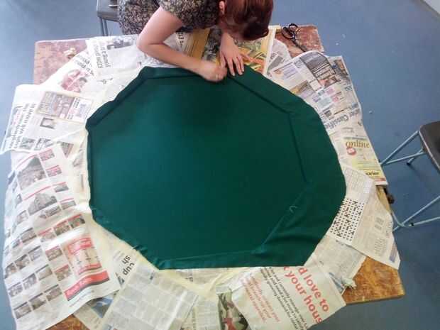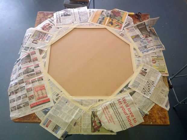 1. Inicie cubriendo todo, pero el interior de su mesa con periódico y cinta adhesiva. Cortan más o menos su paño por lo que sólo es de gran tamaño para el espacio en el centro.