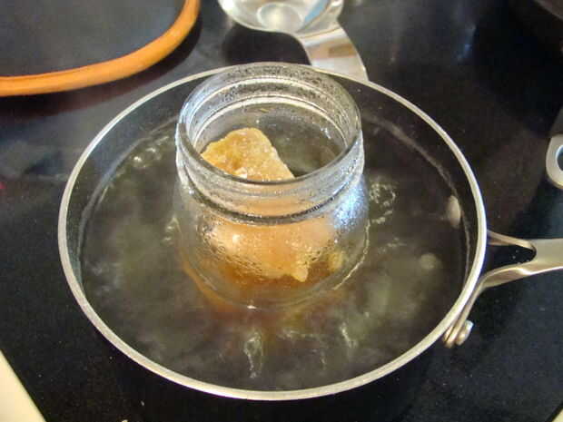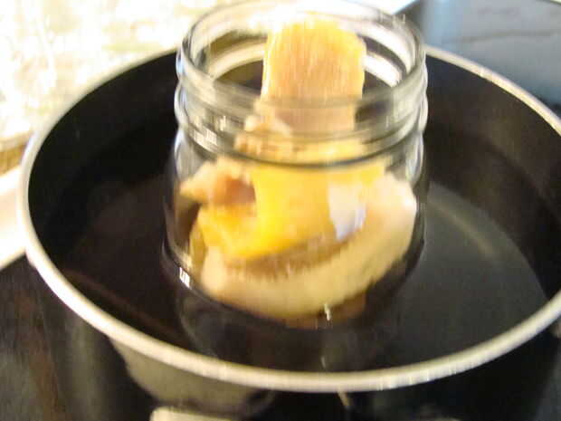 7. Añadir cuidadosamente la cera como vas: sigue añadiendo a su tarro de masón hasta que la cera derretida la cera alcanza los 3/4 del camino completo marca. mantener cocción en agua hirviendo hasta que se derritan completamente.