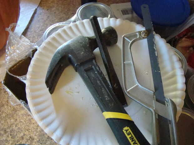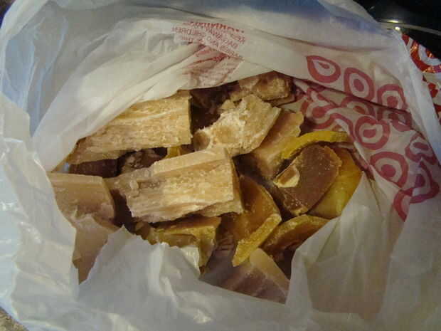 4. romper para arriba las velas!:primero tienes rompe algo abajo antes de que se puede hacer en algo útil otra vez. Usé un cincel y un martillo para romper todas las velas usadas en más fácil de usar/derretir pedazos. Asegúrese de sacar mechas antiguas y platinas metálicas de viejas velas mientras que ellos rompe arriba