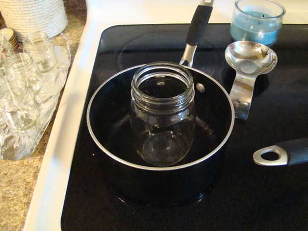 5. Inicio de ebullición que el agua:llene una cacerola 3/4 la forma llena de agua y llevar a ebullición. Luego llenar un tarro de masón con pedazos de vela rota a pesar abajo. Si no haces este paso tu tarro de masón pudiera volcar debido al agua hirviendo aumentando alrededor de él y lo que es inestable y causando su rotura o salpicaduras de agua todo lo caliente, y poner fin a tu diversión la vela que hace por la tarde en una nota mal.