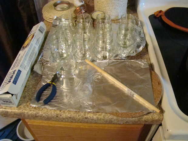 8. palillo mechas en frascos:Asegúrese de sujetar un palillo de dientes a un extremo de la mecha para mantener directamente dentro del frasco durante el vertido de la cera caliente y enfriamiento de la cera, así.