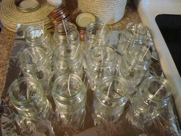 9. adivinaron, vierta la cera caliente!:Vierta toda la cera en como muchos de los envases pequeños como usted puede. Doble las mechas y asegúrate de que son rectas, luego rellenar el tarro de masón con pedazos de cera rota hasta completo y nuevo en agua hirviendo.