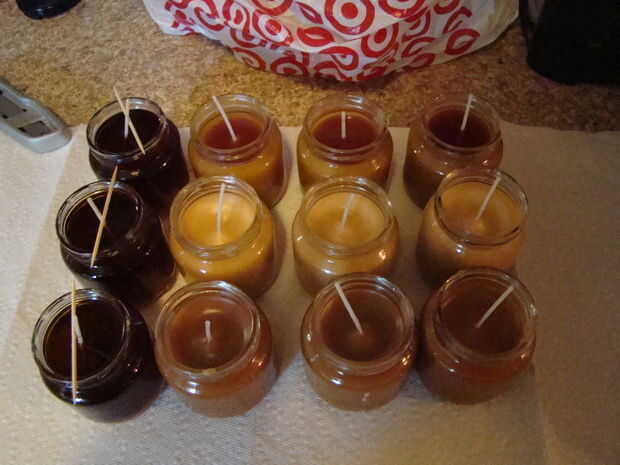 10. comprobar velas mini supervivencia: una vez frío comprobar las velas, se puede notar que la cera ha hecho un "cráter" en el frasco. Eso sucede porque la cera ocupa menos espacio una vez que se solidifica y porque es la parte exterior de la jarra se convierte enfriador rápido que suele ser donde la cera es lo primero. Remedio fácil es añadir más cera en cráter hasta completo.