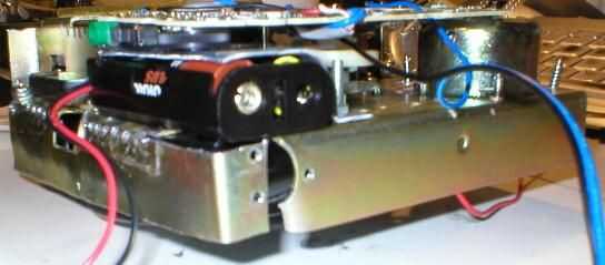 Circuito de Walkman en la parte superior de borde en la imagen y ver en esta foto que el motor está a la derecha, un sostenedor de batería del AA de 2 X 1,5 para alimentar la placa de circuito de Walkman que ahora es soldada a la 8 cabeza de recolección del futbolista pista y está ahí para amplificar la señal y enviarla a los auriculares.