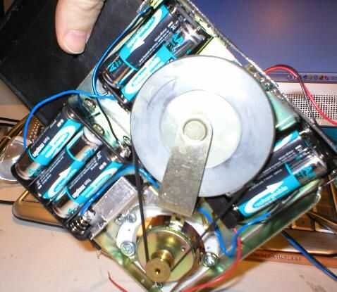 Aquí ver el motor, banda de goma y el volante del reproductor del coche. Utilice todo el espacio alrededor de las baterías. Los jugadores de coche funcionan con 12Volts. Además los 8 mecanismos internos de pista cartucho necesitan mucho más energía que una cinta de cassette, reproductor para mover la cinta suavemente (sin mala wow y flutter) más allá de la cabeza de la cinta. Por lo tanto, debe suministrar el motor con 12Volts. En mi caso esto significa una carga entera de 1.2V recargables montado donde había alguna habitación libre. Usé recargables porque este beastie es probable que comer las pilas.