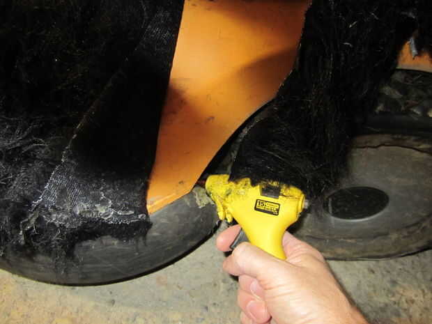 Tomar su material de la piel y cuelgue de la podadora luego completar un corte áspero de material delineando la podadora, dejando varias pulgadas de proyección para recortar más tarde. Mantenga todo sobras trozos para la cubierta de batería y controlador compartimientos, reparaciones menores y para el pelo en las piernas. Usando la pistola de pegamento caliente comienzo colocar la piel hacia el borde delantero exterior y bajo el borde delantero del cortador hasta que todo el filo frontal se pega en. La forma del cuerpo de este cortacésped funciona bien para esta aplicación, pero si usted necesita agregar alguna forma al cuerpo cuando se utiliza un cortador de modelo diferente puede pegar la espuma en la parte inferior del material.