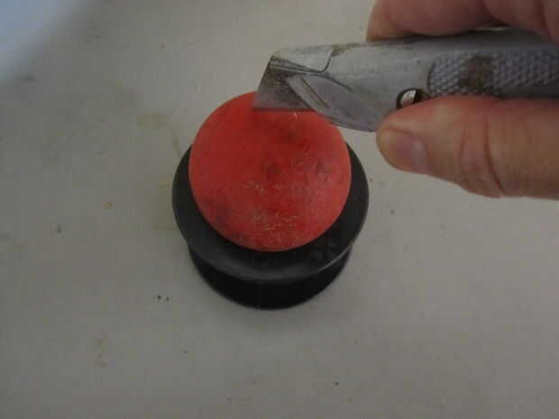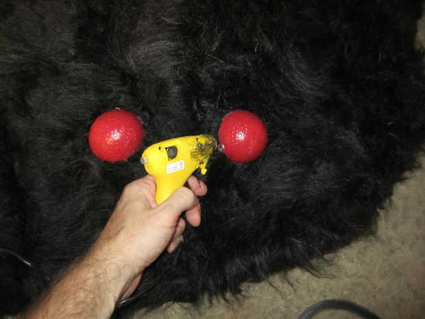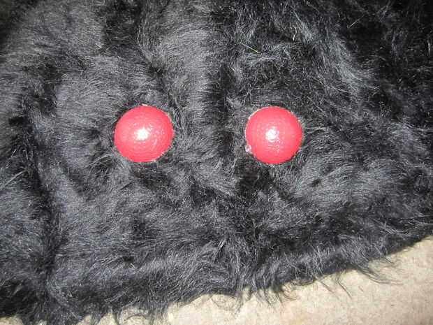 Realizar los ojos cortar una bola plástica en pintura rojo exterior a menos que ya tienes una bola de color rojo y la mitad. Trabajarán dos ojos pero usted puede agregar más. Caliente pegar en el material de la piel en la parte delantera.