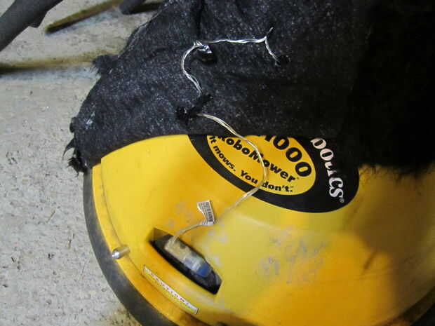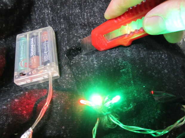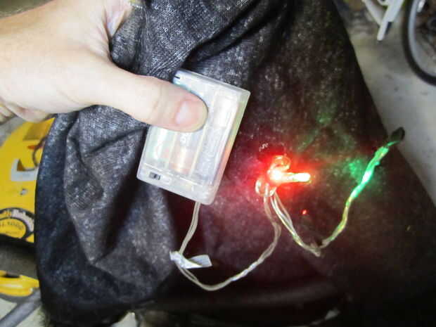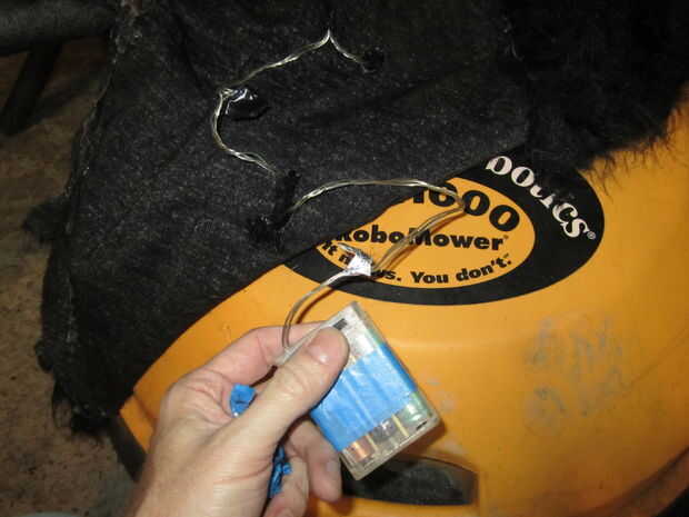A la luz de los ojos; Corte ranuras en el material de detrás de los ojos para insertar las luces LED de una luz batería operada. Usted puede encontrar tiendas de estos paquetes en la electrónica o en tiendas por departamento durante Halloween y Navidad, en unas pilas y un interruptor montado en la parte delantera de la caja de la batería. Cualquier color pack luz LED funcionará. Colocar luces LED a través de las rajas y ojos hundidos. Las luces deben permanecer en el lugar pero puede utilizar pegamento caliente para asegurarlos. Montaje LED de batería en la parte frontal del cortacésped con cinta o lugar en la parte delantera de la manija de apertura, interruptor hacia fuera. Usted será capaz de cambiar las luces de encendido/apagado a través de la piel más adelante.