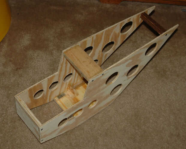 El soporte del alerón trasero es un pedazo de 3/4" cuadrado madera maciza pegados y atornillados en su lugar, su también más estrecha que el resto del fuselaje estructura de soporte y establece la forma cónica de la historia, su 5" largo y tendrá que ser una forma.