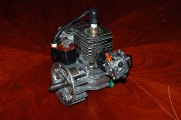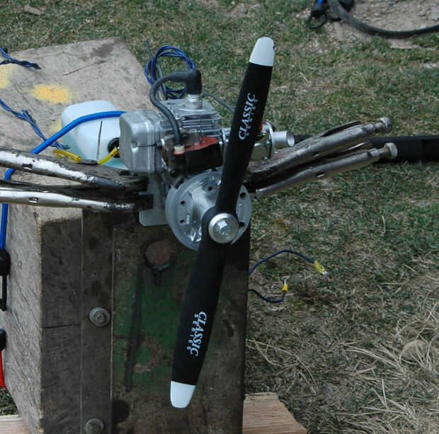 Te darás cuenta empecé con un motor 18cc, voló con esto pero take offs eran muy lentas, y una vez en el aire no haría un bucle. Por eso busqué una versión más grande, podrás ver fotos de ambos motores en este artículo. El motor de 25cc saca 9.5 libras de empuje y el avión se lazo ahora, todavía no un meteoro, pero se puede volar durante treinta minutos en un tanque de gas.