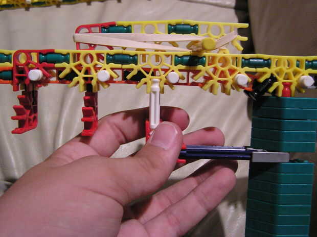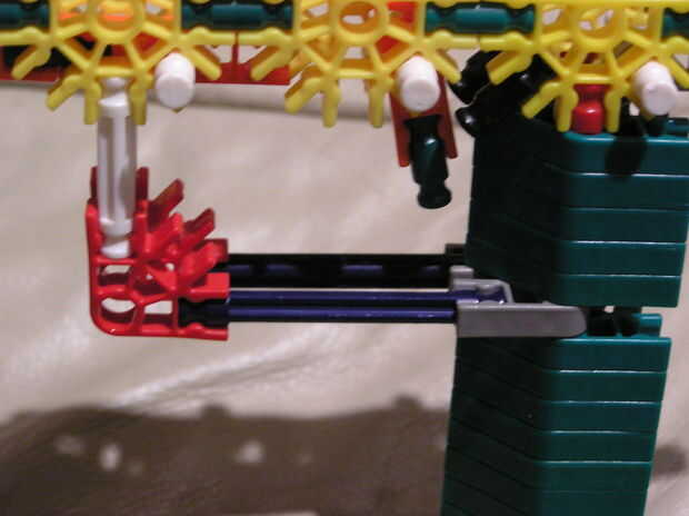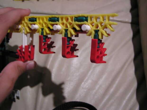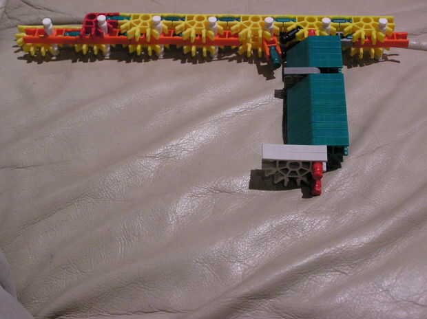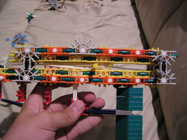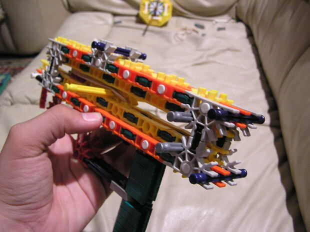 5.) este paso es un poco de un salto, así que Quédate conmigo. En primer lugar, obtener una de las piezas que construyeron justo después de la construcción del cañón y ponerlo encima de la construcción existente. Luego levante la mitad superior del cañón y mantener en su lugar. Luego coloque el otro trozo de reforzando en la parte posterior - simplemente mantenerla por el momento.