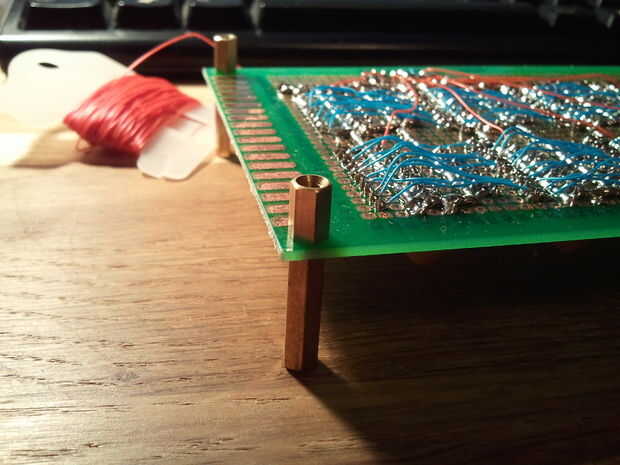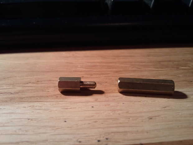 En este punto me di cuenta que estaba haciendo cada vez más riesgoso descansando la Junta en los parte superior componentes mientras trabajaba en la parte trasera. Afortunadamente, en mis cajones de buen material que no tengo, tuve unos espaciadores de brass(?) desde mis días como un técnico de servicio.