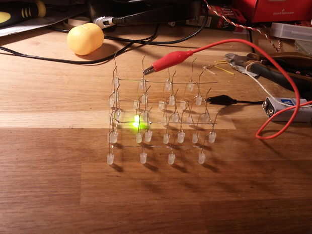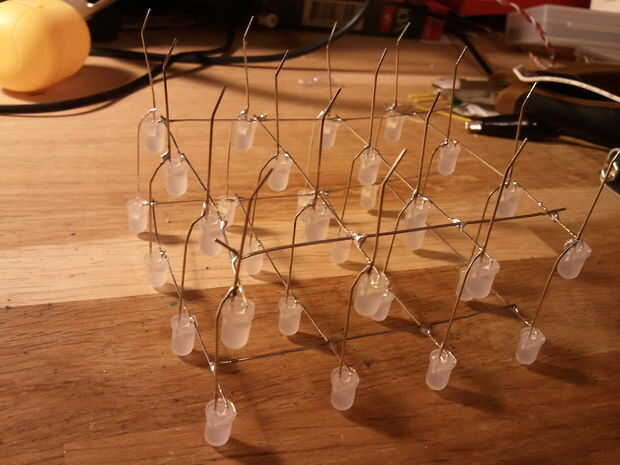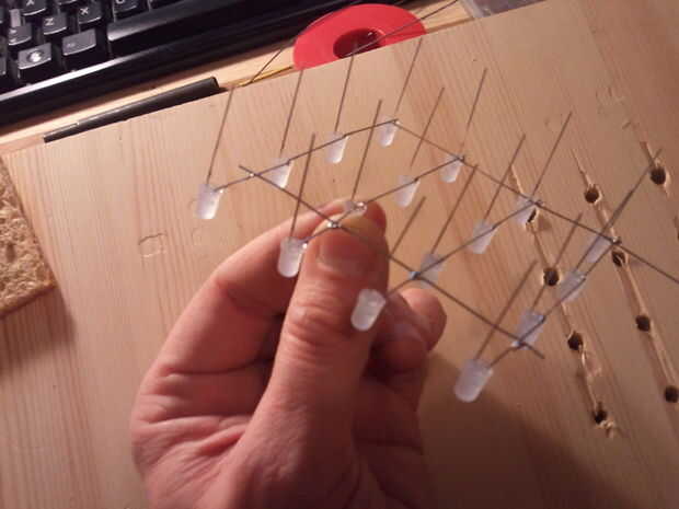 Después de haber construido las dos primeras capas, quería apilarlos uno encima del otro. De repente me di cuenta de que no había doblado la pierna (positivo) más de ánodo para obtener alrededor del bulbo del LED por encima de él. Fue un pequeño dolor que doblará las piernas después de haber soldado las primeras capas. Si la soldadura no es sólida, podría romper de la cepa de se dobla la pierna del ánodo.