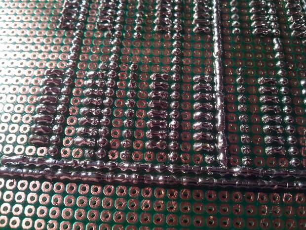 Al soldar los puentes largo continuos, no olvide enjuagar la punta de la plancha de vez en cuando. Pronto bastante comenzará la soldadura se adhiera a la punta y te tire de la soldadura de un ojo a la siguiente, dejando una corta en soldadura. Tómese su tiempo y comprar un montón de soldadura :D