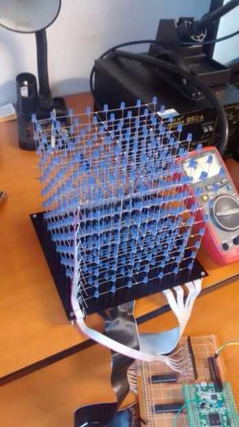 8 x 8 x 8 LED cube con 5 expansores MCP23017 I2C I/O para reducir al mínimo los pines del microcontrolador utilizados para controlar todos los 512 LEDs, así que tenemos sólo 2 cables de conexión con el microcontrolador, el SDA y SCK para la comunicación i2c con los expansores de I/O. Cada uno del expansor IC tiene 16 pines digitales entrada/salida configurados como salidas, cada una de las 5 ICs tiene una dirección de hardware diferente en el bus i2c. ICs hasta 5 en total, 4 se utilizan para controlar las columnas de LED y uno para el control de la layers(selecting). Es más o menos, controlarlo puede usar casi cualquier microcontrolador que tiene soporte de i2c. Para mi proyecto he utilizado un tablero de dev stm32f4discovery porque tenía una colocación alrededor pero se puede utilizar un microcontrolador mucho menos potente.