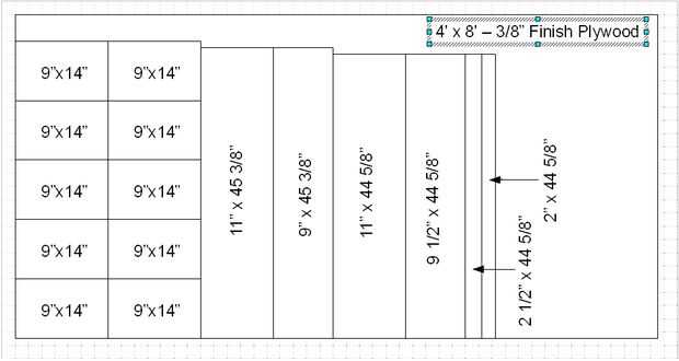 Usar un lápiz y una escuadra para marcar el patrón por encima de la madera contrachapada. Recuerde el viejo adagio para medir dos veces y corte una vez. Si te equivocas por todavía tiene unos 22" de madera contrachapada de izquierda para recuperar. Usé una sierra circular para cortar las piezas hacia fuera, pero si lo desea puede utilizar una sierra reciprocante. Creo que puedo conseguir un borde de aspecto más recto, más profesional usando una sierra circular vs una sierra reciprocante. De cualquier manera sólo tenga cuidado de no cortar los dedos. No te olvides de tener en cuenta la anchura de la hoja al marcar la madera contrachapada. Cuando haya terminado deben medir las piezas cerca de lo que se muestra en el patrón.