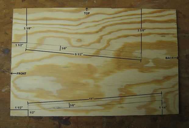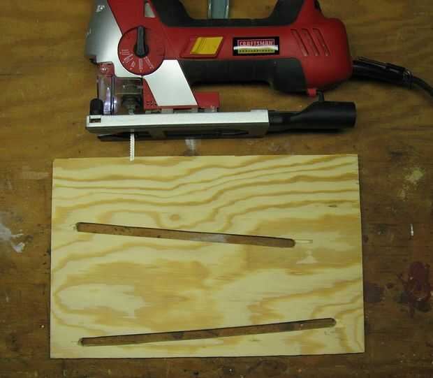 Tomar uno de la 9 "x 14" madera contrachapada de piezas y marcarlo como se muestra en la primera foto de abajo. Ahora perfore los dos extremos de las ranuras utilizando un 3/8" bit como se muestra en la segunda foto. Por último usar la sierra alternativa para cortar dos ranuras como se indica en la tercera foto. Cuando las ranuras de corte, asegúrese usted cortar justo fuera de las líneas porque necesitan acomodar las piezas de 9 1/2 "x 44 5/8" y 11 "x 44 5/8", como se muestra en la cuarta foto. Una vez tienes las ranuras de corte ajuste de prueba de las piezas de 9 1/2 "x 44 5/8" y 11 "x 44 5/8" como se muestra en la foto. Cada tabla debe ser capaz de pasar todo el camino a través de su ranura respectiva.