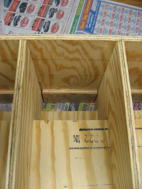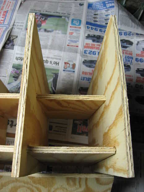 De la madera contrachapada desechos izquierda, cortan 9 piezas que miden 4 1/2 "x 2 1/2". Coloque 4 1/2 "x 2 1/2" piezas para interior de madera contrachapada, a fijarse. El pequeño 4 1/2 "x 2 1/2" bloques alineados con el borde inferior de la espalda. Use pegamento para madera y clavitos pequeños para fijar los bloques de 4 1/2 "x 2 1/2" como se muestra en las dos últimas fotos. Realmente agregué estos bloques al final, cuando me enteré de que las latas podrían atascarse si la gota y no gire hacia delante antes de que el siguiente puede gotas. Bloque pequeño patea la lata hacia adelante por lo que no puede atascarse por el siguiente puede. La última foto de la serie muestra la vista desde arriba donde las latas se caerán de la rampa superior.
