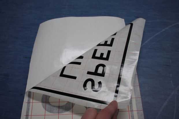 Usando cinta de la transferencia, levante las pegatinas de vinilo de su papel de apoyo y les Coloque cuidadosamente sobre la base de la espuma. Alise cualquier burbuja de aire y retire la cinta de la transferencia.