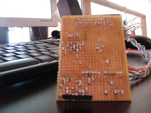 Luego pongo los circuitos terminados en una bañera vacía margarina que cubrí en papel. El teclado cable atado en la tina. Corte un rectángulo que el teclado podría caber en de debajo. Luego poner un agujero en cada esquina y había roscado el lazo de cable a través de la tina y cada hoyo por debajo. Luego les tiró firmemente. Lugar el teclado en firmemente bastante para mí.
