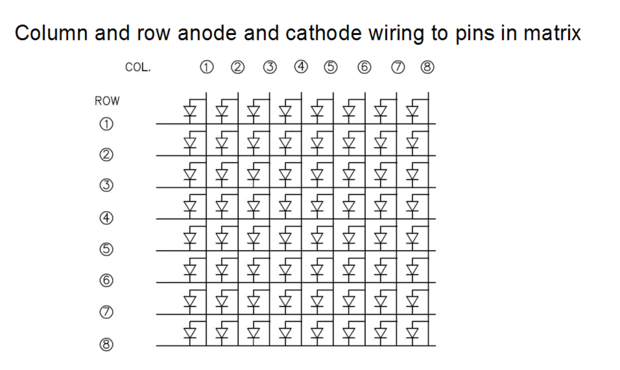 Por lo tanto, podemos utilizar esta teoría de LED en la siguiente matriz. Si conectamos 1 Col tierra y 1 fila a un + voltaje entonces el LED donde estas dos líneas se encuentran con voluntad enciende. Ningún otro LED se encenderá debido a la no tensión que fluye a ellos. Si invierte el voltaje en una de las líneas de continuación LED se apagará.
