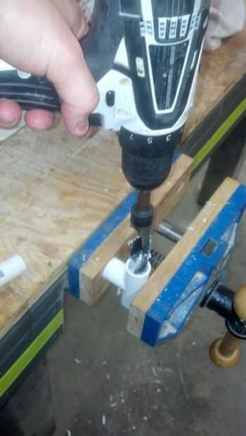 Primer paso es perforar hacia fuera de la parada de cada 1/2" Tee, por lo que el T luego se deslice libremente sobre un trozo de tubo de pvc de 1/2". Abrazadera t entonces con 7/8" bit lentamente perfore la parada intermedia de cada Tee.