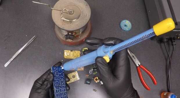 Un buen manual de soldadura sucker como ésta funciona bastante bien para quitar selectivamente a través de partes de los agujeros de un PCB. Más baratas y más pequeño unidades no funcionan así. Está comercializadas como compacto pero no funciona así debido a la longitud de movimiento limitado y cilindros más pequeños.