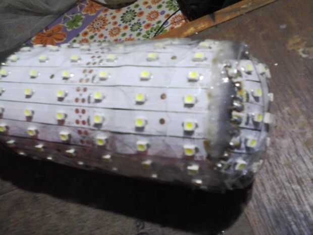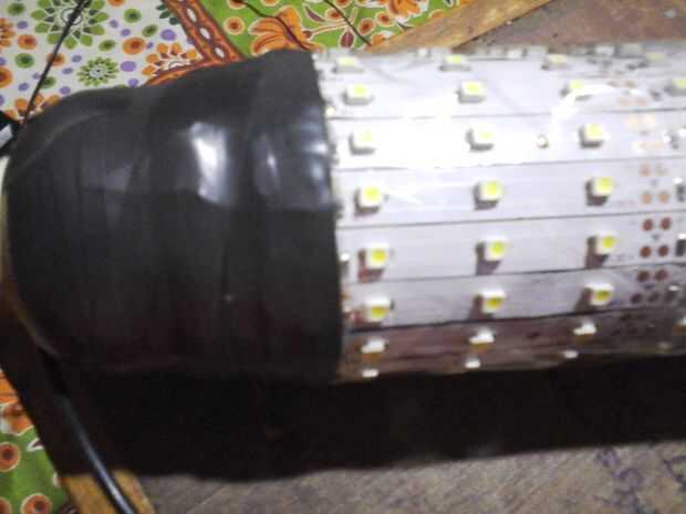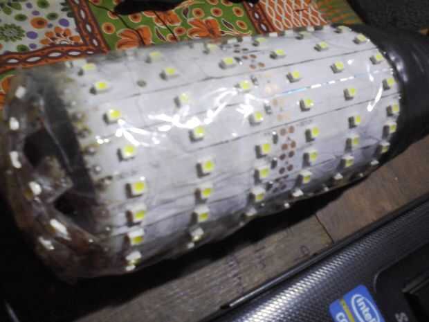 5) envuelve una hoja de celofán plástico alrededor de los led y cinta adhesiva en la parte inferior de la lata