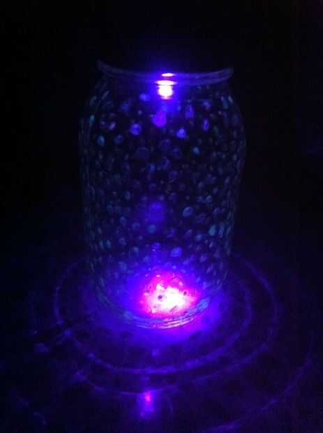 La jarra de la estrella comenzó inicialmente como un tarro de masón glowy que encargué con luz normal o una pequeña negra. Era lindo, pero el efecto resplandor no duró mucho tiempo, y la negra sacó la tapa de la jarra una buena pocas pulgadas. No es práctico en lo más mínimo. Así que creo, "¿por qué no añadir un LED UV a la parte superior de la jarra?" Siendo un niño de colegio se rompió hizo la parte más difícil de lo que hubiera gustado.